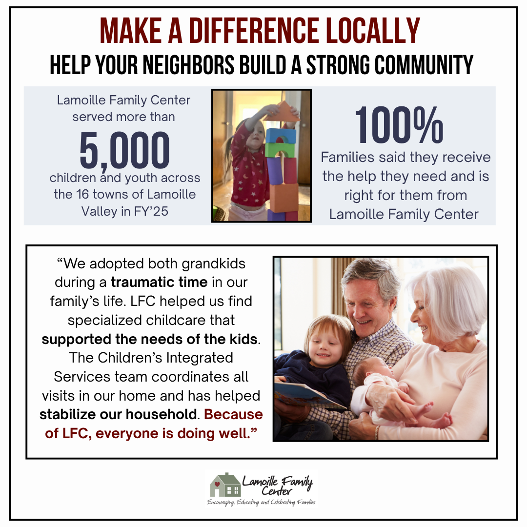 Contributions can be made electronically, mailed, or delivered to our office at 480 Cady’s Falls Road Morrisville, Vermont 05661. Contact our Development Director Julia Skonicki for more information at 802-888-5229 ext. 125 or click here to email her directly.